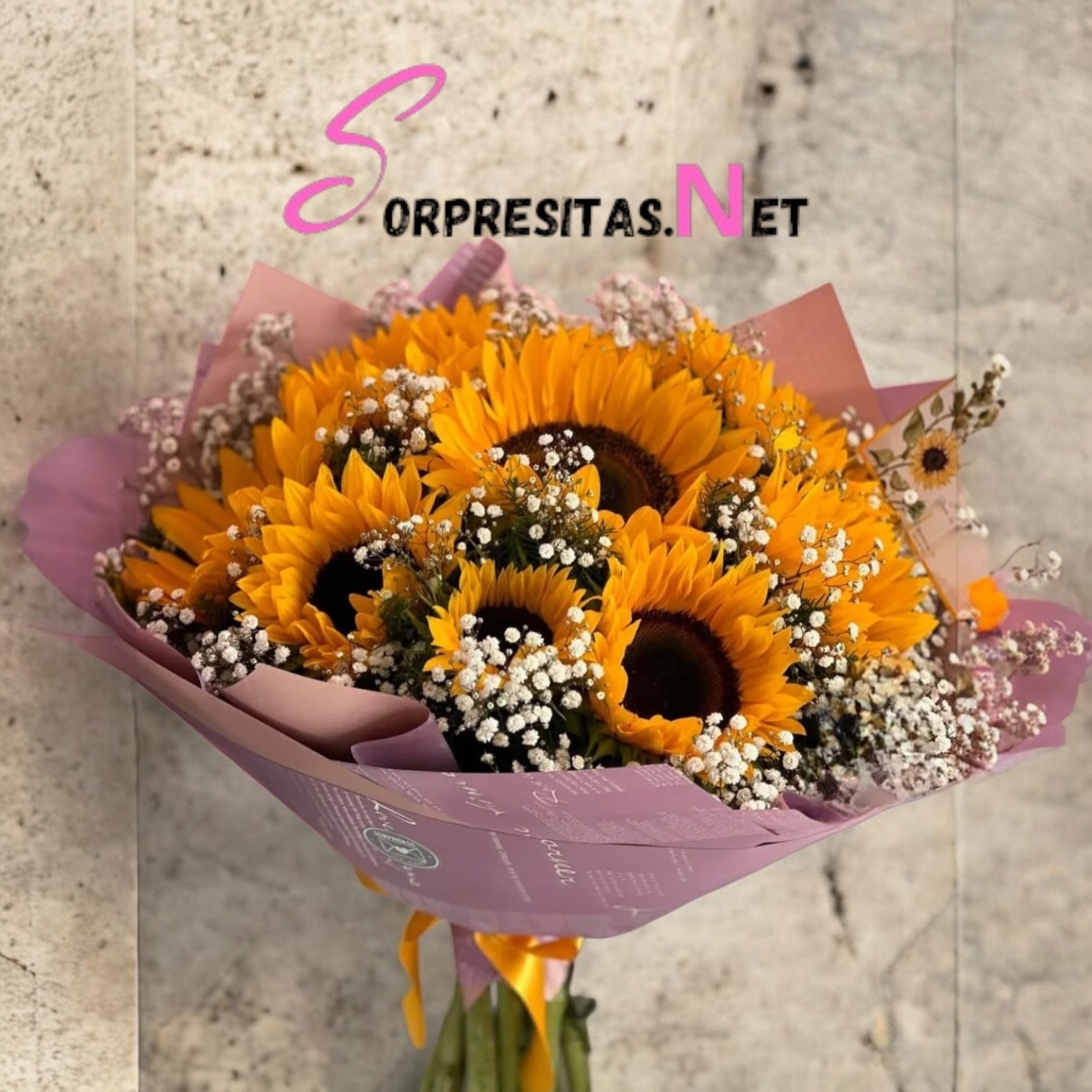 & Free ShippingUn imponente ramo compuesto exclusivamente por girasoles premium y nubes de gypsophila. Envuelto en papel coreano lavanda, es el regalo perfecto para iluminar el día de alguien con alegría pura.