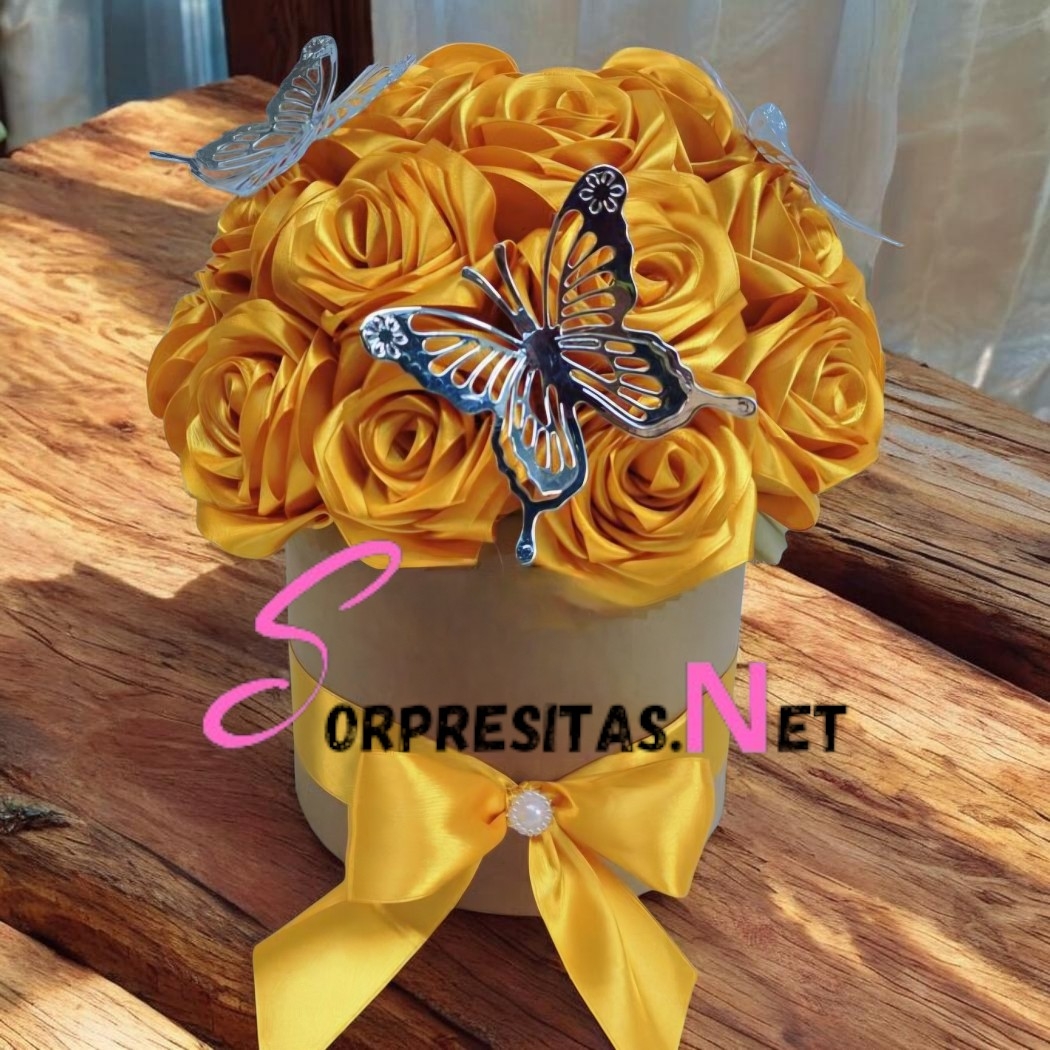 Exclusivo arreglo de rosas eternas hechas a mano en listón satinado color amarillo vibrante. Presentado en una sombrerera artesanal con detalles de mariposas caladas y un lazo de seda con centro de perla. Un regalo luminoso que simboliza alegría y éxito, diseñado para durar por siempre.