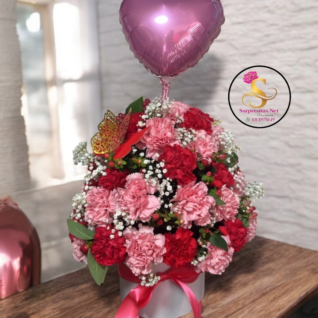 El diseño se presenta en una moderna base cilíndrica blanca, acentuada por un elegante lazo de satén rosa que refuerza su delicadeza. Para añadir un toque de magia y altura, el arreglo incluye: Un globo metalizado en forma de corazón color rosa. Una delicada mariposa decorativa dorada y roja, simbolizando la transformación y la belleza.