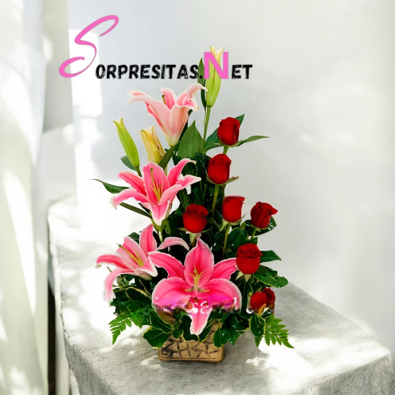 Elegante composición vertical que combina la majestuosidad de los lirios (liliums) rosados con la intensidad de las rosas rojas. Un regalo lleno de significado y distinción.